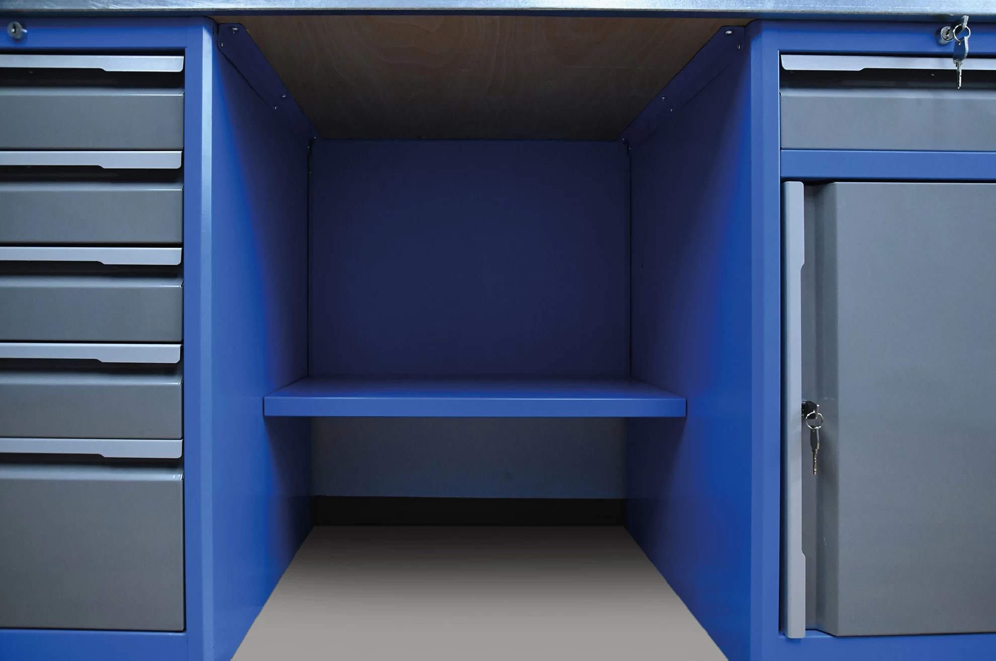 - Верстак состоит из прочной двухслойной столешницы, поддерживаемой двумя тумбами из профилированной холоднокатаной стали, и полки-стенки.